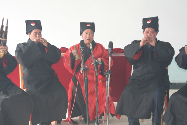 所谓寺庙音乐,就是根据道教经文配以音乐,宣扬道教人文伦理的一种艺术。它集念经、讲坛、音乐伴奏于一体,给人带来一种高雅的艺术享受,多少年来,一直活跃在寺庙庆典、民间红白喜事操办活动中。乐队一般有8~10人,主要乐器有笙、管、笛、铙钹、铃子、铛、云锣、钹玉、磬等。经文音曲主要有“玉皇赞”、“十报恩”、“鬼门关”、“沐浴堂”、“三奠酒”、“五供养”、“大乘经”、“小乘经”、“千手佛”、“步虚”等十几种。杨润春自儿时起便得到父亲真传,十八般武艺样样精通,念经掌法倒背如流,至今已整整坚持了60多年(中间一度中断)。