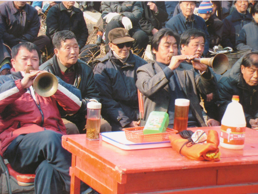 任连义的三节唢呐是自家传承的绝技,区别于其他门派,技艺很难掌握。唢呐长38厘米,定调为f调,属于中音唢呐,由三节组合而成。演奏时一节节摘去,摘掉第一节后为28厘米,摘掉第二节后为22厘米,按理音域、音色会有很大的变化,但他能靠娴熟独特的吹奏技巧,使其始终保持原来的音域、音色,从最低音到最高音15度唢呐原声、调式不变,这就是他家的祖传绝活“拔三节”,其精湛的技艺令人拍案叫绝。