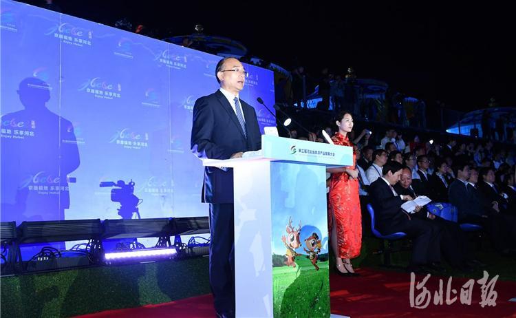 7月18日晚,第三届河北省旅游产业发展大会暨旅游文化推介会在如诗如画的承德坝上草原开幕。省委副书记、省长许勤致辞并推介河北旅游。 河北日报客户端记者孟宇光 田明摄