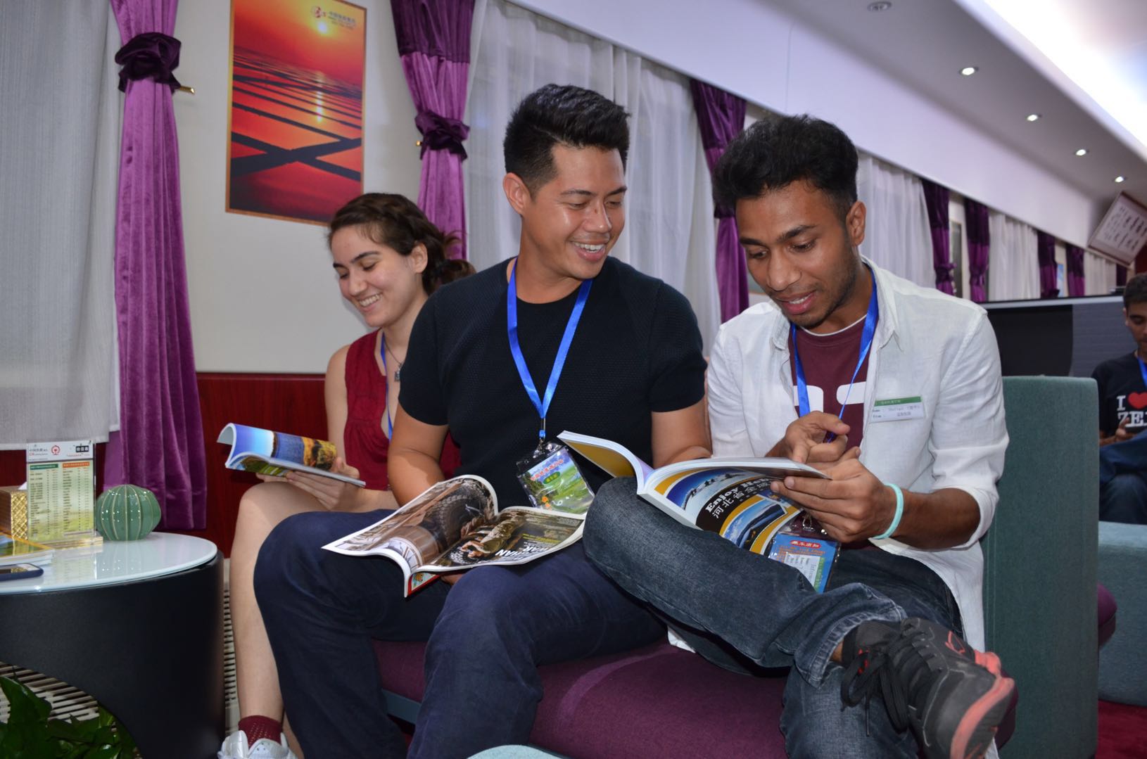 外国游客在“乐享河北号”翻阅河北旅游画册