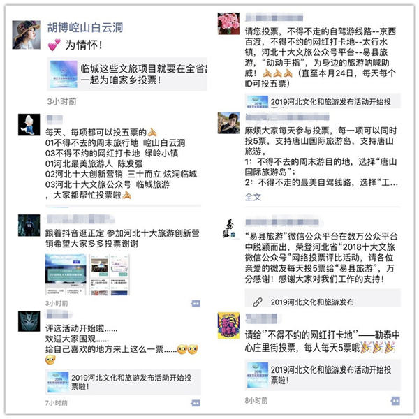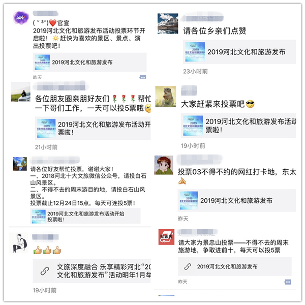 邢台等多个市的文旅部门官方微信号,将本市入围项目从投票网页中截取下来,做成微信文章进行推送,每天还从不同角度报道入围项目,并链接投票入口。张家口旅游委副主任、正定县委宣传部副部长等多位地方相关部门负责人,每天在朋友圈转发投票信息,号召大家踊跃投票,为家乡项目加油。
