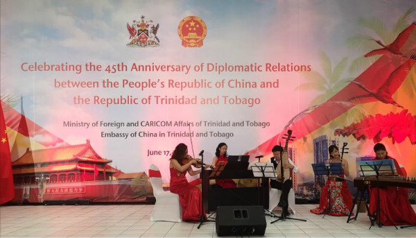 17日晚,由中国驻特多大使馆与特多外交和加勒比共同体事务部共同举办的庆祝中特建交45周年招待会在特多首都西班牙港举行,中国驻特多大使宋昱旻、特多国家安全部长兼总理府事务部长斯图尔特·杨、住房和城市发展部长迪龙、文化部长多利、总警长格里菲斯、西班牙港市长马丁内斯、圣费尔南多市长瑞格莱罗等政府高官,多国驻特使节和国际机构代表,当地工商、文化、媒体等各界人士,华人华侨、中资机构及孔子学院代表等300余名来宾出席。