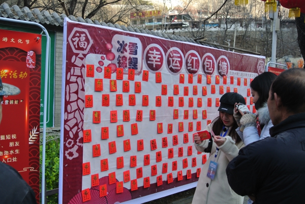 今年,为了增加景区与游客的互动,今年的沕沕水冰瀑旅游文化节还推出了“冰雪锦鲤”活动。活动设线下抽奖及线上参与两部分,“线下”是在开幕式过程中,抽取“锦鲤”红包,送出沕沕水冰瀑节门票、现金红包等礼品;“线上”则是开设抖音和微博话题:#冰雪锦鲤#,在线上发起活动参与通知,并将有奖活动通知张贴在景区入口处。游客只需拍摄短视频或者图片,上传至抖音、朋友圈和微博等网络平台,并@沕沕水生态风景区,即可现场领取红包。