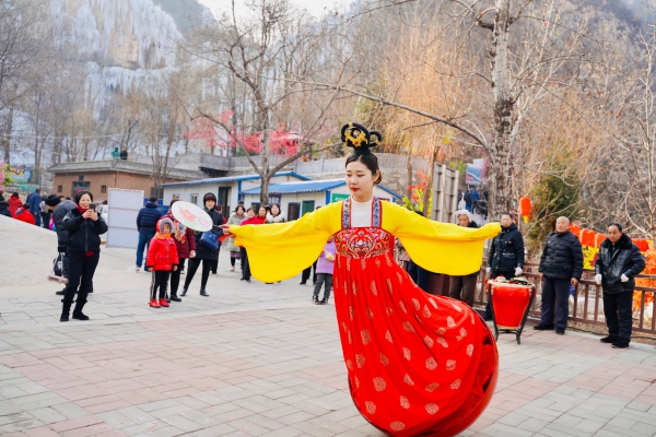 为了带给游客更好更新鲜的体验,沕沕水景区专门设置了“网红打卡地”,布置拍照场景,放置雪花机,让游客体验“一不小心就白头”的奇妙感受,十分浪漫。在冰瀑节期间,景区增设“网红不倒翁之沕沕水分翁”,由身着古装的演员进行表演,游客不仅可以近距离接触火遍网络的不倒翁小姐姐,还可以登上不倒翁进行切身体验,十分有趣。开幕式当天,还有地域特色突出的西调秧歌、舞龙舞狮等非遗表演,现场氛围十分热烈。