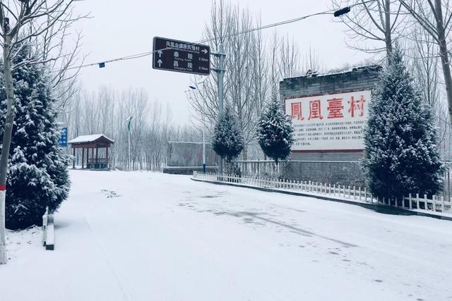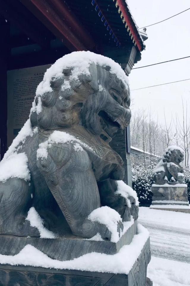 走近凤凰台,村口门楼两侧"凤凰山不墨千秋画,易水河无弦万古琴"的楹联苍劲有力,在瑞雪映衬下一对石狮子更显古朴庄重。
