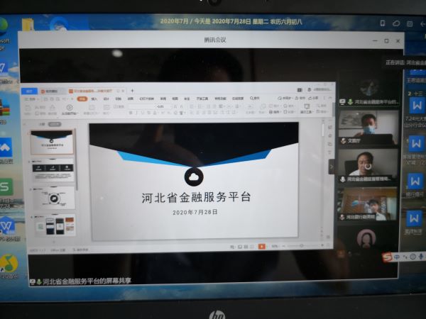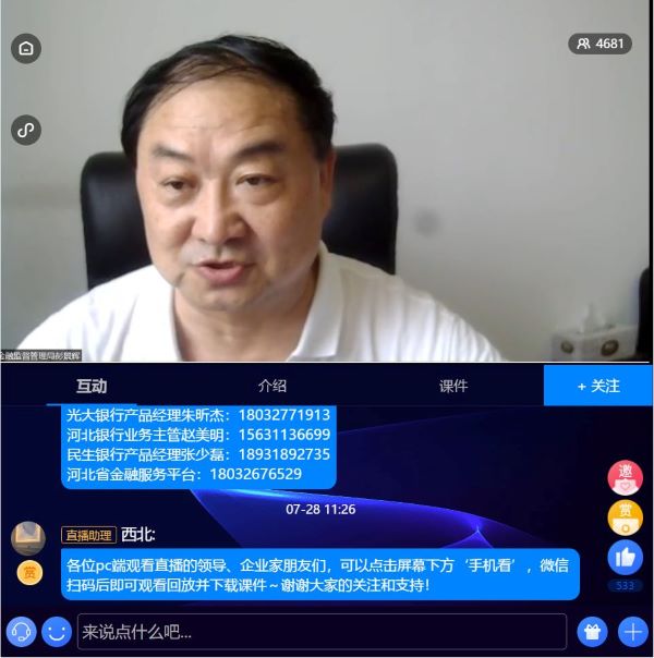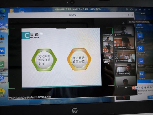 会议以线上视频形式召开,河北省地方金融监管局副局长彭景辉主持会议,省文化和旅游厅副厅长赵学锋致辞。人民银行石家庄中心支行专家李婕琼讲解货币信贷支持政策,河北银保监局专家耿磊讲解普惠金融政策,交通银行河北省分行苏浩讲解本行金融政策及相关信贷产品,光大银行石家庄分行王伟强讲解本行金融政策及相关信贷产品,华夏银行石家庄分行吴泽讲解本行金融政策及相关信贷产品,民生银行石家庄分行张天然、张少磊讲解本行融资政策及相关信贷产品,河北银行赵美明讲解本行金融政策及相关信贷产品。