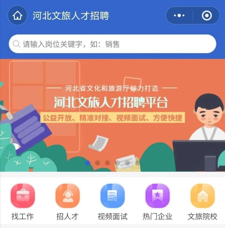河北文旅人才招聘平台包含招人才、找工作、视频面试、热门企业、文旅院校、行业资讯等模块功能。招聘企业注册审核通过后可自主发布岗位需求,通过“招人才”精准搜索各类专业人才,通过手机端与求职者实现电话、直聊、视频面试。求职者注册登录后可快速创建简历,通过“找工作”精准搜索各类文旅企业与岗位信息,针对意向岗位精准投递简历,通过手机端与招聘企业实现电话、直聊、视频面试。平台将实现后台数据统计应用,及时对招聘企业和岗位信息、求职者信息进行统计分析,实时反映招聘情况,全面反映文旅企业岗位和人才需求,求职者特点,为全省文化和旅游人才建设提供科学依据。平台设置热门企业、文旅院校展示专区,为各类文旅企业、院校搭建沟通渠道,方便校企对接。及时发布文旅行业发展动态、政策法规等行业资讯,为招聘企业和求职者提供即时行业新闻,了解行业发展情况。