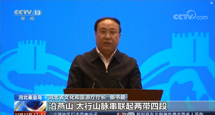 12月11日 ,CCTV-13新闻频道新闻直播间播报《长城国家文化公园建设推进会》,报道了河北省在推进长城文化公园项目建设、加强长城文化保护、发展长城文旅融合等方面的好经验、好做法。推介会上河北省文化和旅游厅党组书记、厅长那书晨就河北长城国家文化公园建设情况,从四个方面作了简要汇报。