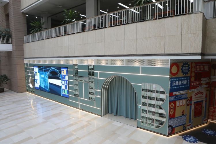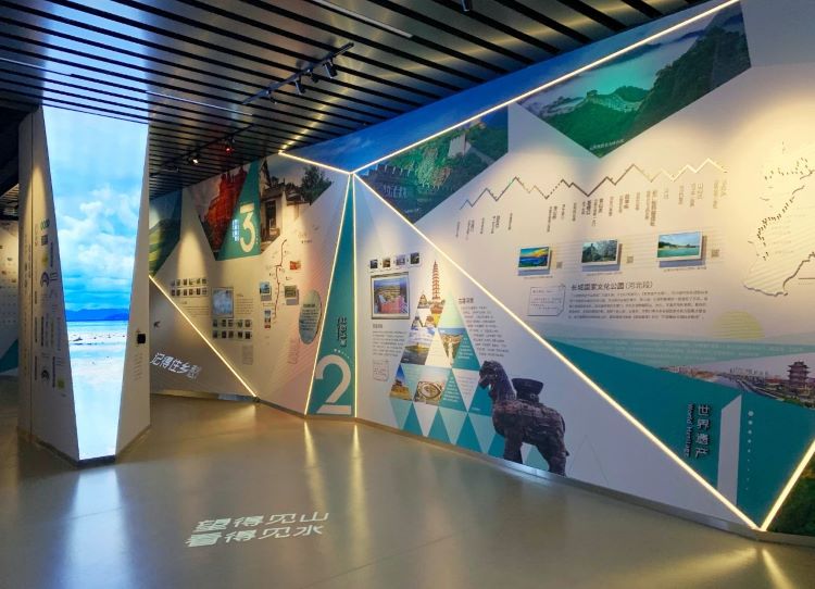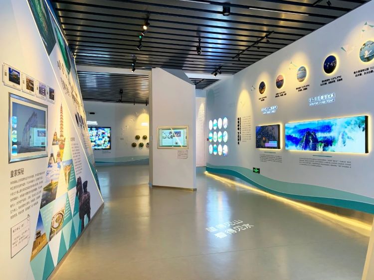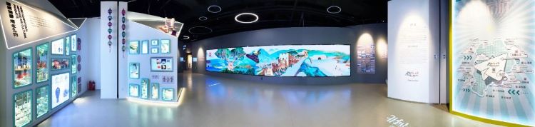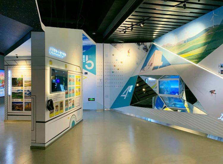 在旅游资源导览区,通过多媒体艺术展墙对河北旅游的自然资源及人文历史提供导览的同时,也让数字展成为链接河北旅游线上线下资源的数据库;在旅游信息导览板块,象征河北山川的连续三角形折面墙空间,展示出世界遗产、红色华章、太行/坝上天然氧吧、潮流畅玩、趣味乐享等旅游资源,另一面波浪起伏的水纹设计、“与鸟同行”的意象重点凸显了河北省特有的生态之美。其中,主视觉区域以四屏联动的形式展示出河北省历届旅发大会及文旅融合的成果项目。整个导览区通过二维码进行串联,将线下展示和线上旅游资源全部链接起来,将有限的资源无限延伸。
