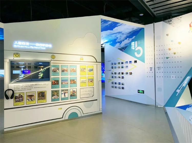 河北数字旅游体验展首先是一个艺术展。开篇的“山水乡愁”视觉艺术装置、连续折面墙的空间象征山形阳刚之美、波浪起伏的曲线设计及光影变化象征水的阴柔,体现出“望得见山,看得见水,记得住乡愁”这一核心设计理念——旅游让人们重归山水,感怀乡愁。其中,山水乡愁视觉艺术装置既是乡愁的承载和寄托,也形成了对河北省文化渊源和大美山水的艺术化表达,由透明亚克力材质制作的地图装置,配合染色灯光,在一呼一吸之间,体现出不可触及的淡淡乡愁,如烟、如云,又美轮美奂。整个展览以“人在旅途”为线索,强调了旅游日益成为一种现代人的生活方式,展示出从古至今旅途中人们的体验与感悟。该线索起于对“世界那么大,我想去看看”的向往,呼应序厅“山水乡愁”视觉装置的艺术表达与情感投射,随着展厅内“旅途游记”的应景抒怀,展示出基于“吃、住、行、游、购、娱”所承载的现代旅游生活方式,终篇于“读万卷书,行万里路”,折射出人们对旅游的“态度”与“温度”。