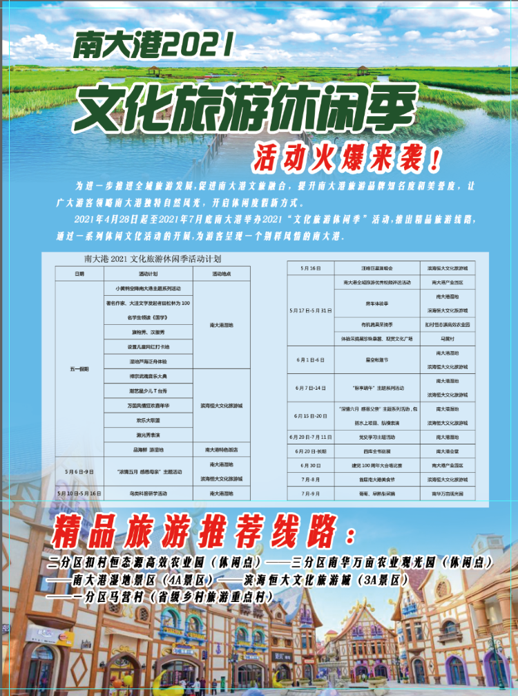 据了解,南大港2021“文化旅游休闲季”活动将从即日起至7月底打造精品旅游线路,推出湿地芦海泛舟,旗袍秀,汉服秀,著名作家、大洼文学发起者田松林领读国学经典,禅宗武魂音乐大典,潮艺星少儿T台秀,万国风情狂欢嘉年华,海鲜美食节,巨星演唱会,鸟类科普研学,南大港全域旅游优秀视频评选,有机蔬果采摘季,星空帐篷节,粽享端午主题活动,党史学习,房车营地等十余项活动,以此增加旅游人气和关注度,带领广大游客充分领略南大港独特的自然风光和深厚的文化底蕴。