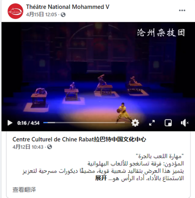 由拉巴特中国文化中心与河北省文化和旅游厅共同主办,河北省艺术中心和河北省杂技家协会协办的“河北文化旅游月”线上推广活动4月30日在摩洛哥落下帷幕。此次活动为期5周,集中展示了河北省文旅资源,受到摩洛哥民众欢迎。