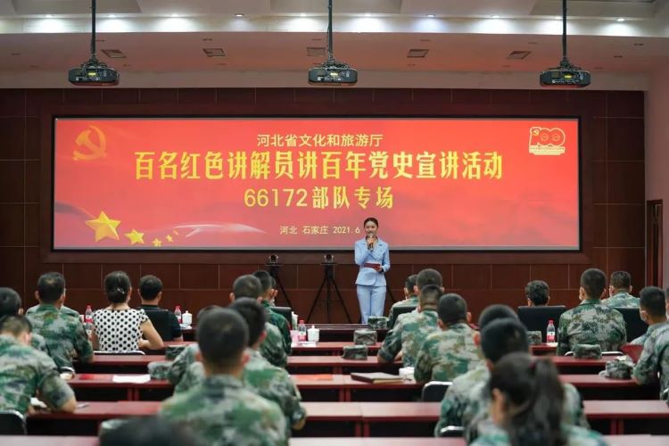 为庆祝中国共产党成立100周年,深入开展党史学习教育,6月10日,河北省文化和旅游厅主办、河北省红色旅游协会承办的“百名红色讲解员讲百年党史”宣讲活动走进部队开展专场宣讲,为部队广大官兵带来了一场精彩的百年党史精神盛宴。