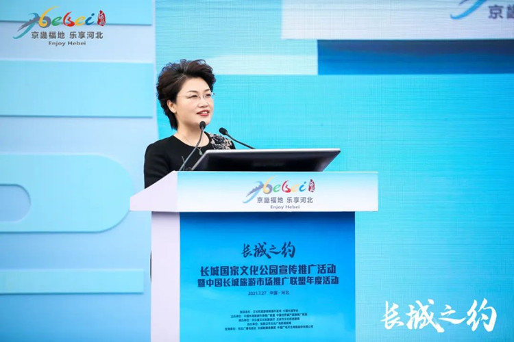 王荣丽在致辞中表示,河北是长城文化资源大省,汇集了众多长城精华。有“两京锁钥无双地,万里长城第一关”的山海关,有“万里长城,金山独秀”的金山岭长城,有“万里长城第一山”的角山,还有“万里长城第一门”的大境门,一起构成了丰富多彩的长城文化旅游资源宝库。河北省委、省政府高度重视长城文化保护传承和长城文化旅游发展,近年来,河北大力挖掘长城文化内涵,强化长城资源保护,打造提升长城景区,完善旅游交通等基础设施,大力实施片区综合开发,长城文化旅游呈现出全新面貌。自2014年河北联合北京等8省区市旅游部门成立中国长城旅游市场推广联盟以来,联盟成员单位多次共同赴海外重点客源市场,开展“美丽中国、古老长城”系列主题推广活动;协调组织了“千名美国游客游长城”、金山岭长城·全球旅行商推介活动、“行走长城”百集系列采访报道等多项重大活动营销,有力提升了中国长城旅游品牌的海外知名度和影响力。2020年,中国长城旅游市场推广联盟实现扩盟,将15个长城沿线省区市全部汇聚到一起,在秦皇岛召开了“2020中国长城旅游市场推广联盟”活动,举办了“2020长城国际旅游摄影展”,掀开了长城旅游市场推广联盟崭新篇章。