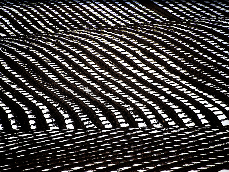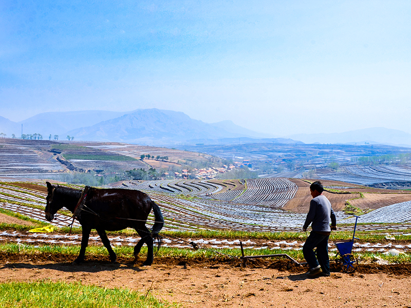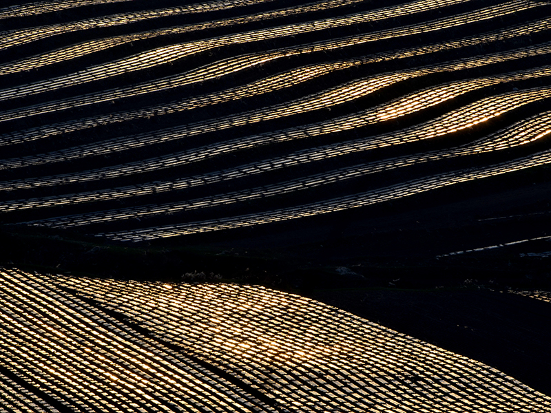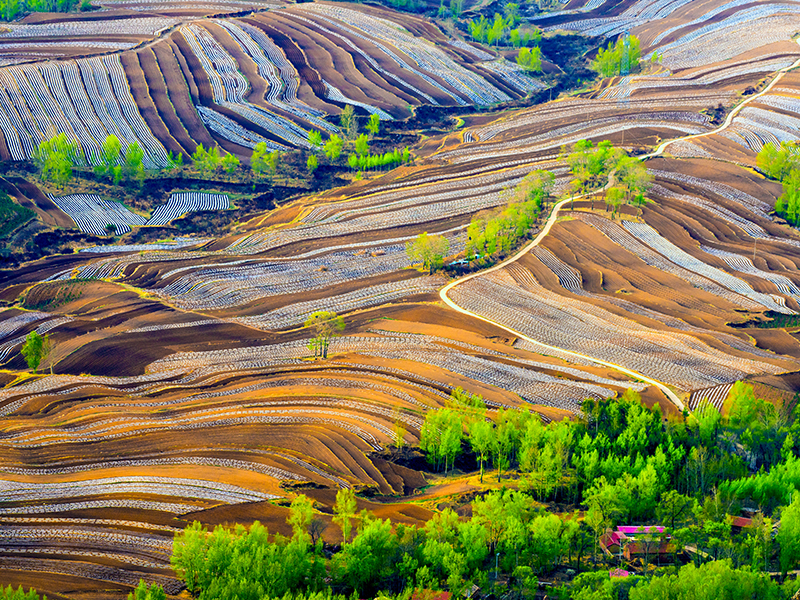 与种植水稻为主的南方梯田不同,围场梯田为旱作梯田,主要作物有马铃薯、玉米、谷物等,播种时需覆盖白色地膜。阳光映射下,地膜似道道白浪,呈现出北方梯田景观的独特一面。