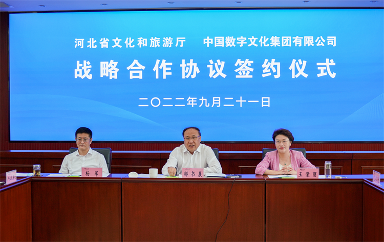 9月21日,河北省文化和旅游厅分别与中国数字文化集团有限公司、中国文化传媒集团有限公司、中国东方演艺集团有限公司通过远程视频连线方式签订战略合作协议。河北省委宣传部副部长,省文化和旅游厅党组书记、厅长那书晨发表致辞,河北省文化和旅游厅党组成员、副厅长王荣丽,党组成员、副厅长杨军分别主持签约仪式并签约,相关处室负责人出席签约仪式。