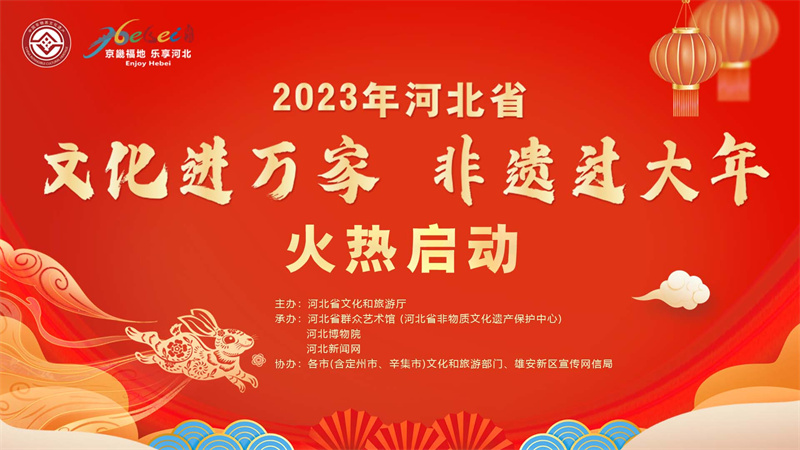 此次活动由河北省文化和旅游厅主办,河北省群众艺术馆(河北省非物质文化遗产保护中心)、河北博物院、河北新闻网承办,各市(含定州市、辛集市)文化和旅游部门、雄安新区宣传网信局协办。 2023年河北省“文化进万家 非遗过大年”活动在河北博物院设主会场,各市设分会场,同步开展线上线下宣传展示活动。