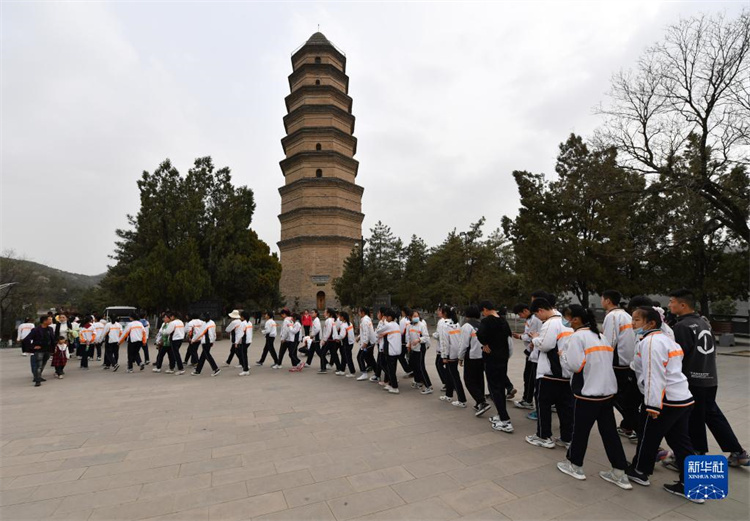 参观者在陕西延安宝塔山参观(2021年3月30日摄)。新华社记者 张博文 摄
