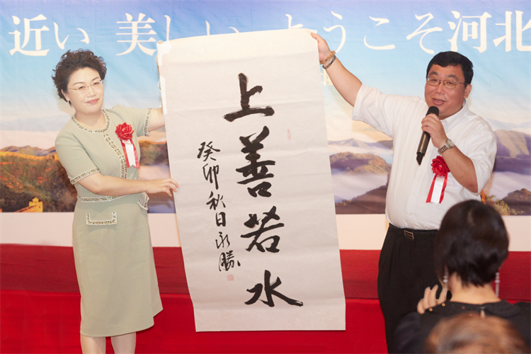 张永胜表示,今后大阪的春节祭活动将与河北省全方位合作,非常期待2024年2月在大阪举办的第八届大阪春节祭上河北节目惊艳日本。他还现场挥毫写下“上善若水”赠与河北文旅代表团,希望水城大阪与河北省的交流一衣带水,源远流长。