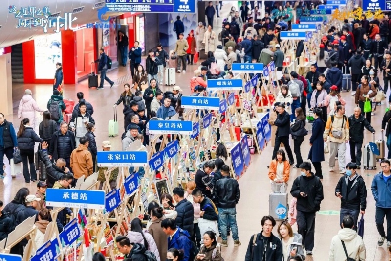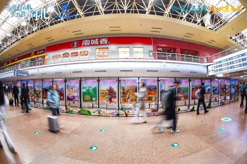 北京西站活动现场,二层的候车室通道化身成充满燕赵风情的文旅站台,精心布置的展区成为旅客们关注的焦点。活动巧借北京西站巨大客流,将河北文旅资源直接送达旅客身边。